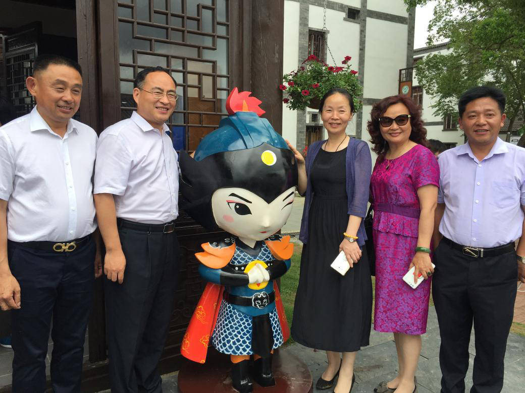 來(lái)訪領(lǐng)導(dǎo)及景區(qū)負(fù)責(zé)人同木蘭有禮品牌吉祥物“木蘭將軍”合影留念
